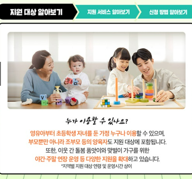 영유아부터 초등학생 자녀를 둔 가정 누구나 이용할 수 있으며, 부모뿐만 아니라 조부모 등의 양육자도 지원 대상에 포함됩니다. 또한, 이웃 간 돌봄 품앗이와 맞벌이 가구를 위한 야간·주말 연장 운영 등 다양한 지원을 확대하고 있습니다.