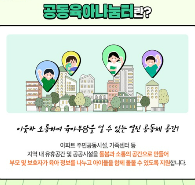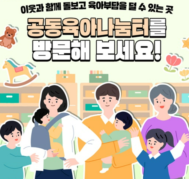 "공동육아나눔터"란 핵가족화로 인해 약화된 가족돌봄 기능을 보완하여 부모의 육아부담을 경감하기 위해 지역사회가 참여하는 돌봄공동체 조성을 통해 양육 친화적인 사회환경 구축을 사업목적으로 하고 있습니다.