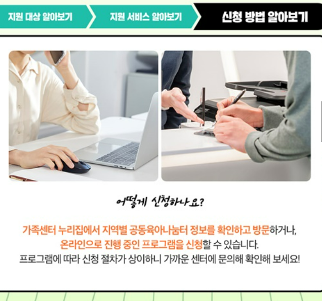 포털창에 ‘가족센터’ 검색 → 돌봄지원 → 공동육아나눔터