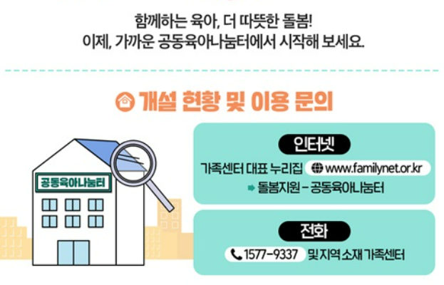 가족센터 누리집에서 지역별 공동육아나눔터 정보를 확인하고 방문하거나, 온라인으로 진행 중인 프로그램을 신청할 수 있습니다.