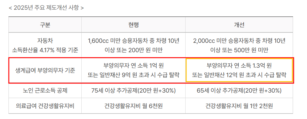 - 생계급여는 부양의무자가 ‘연 소득 1억 원 또는 일반재산 9억 원 초과’할 경우 수급에서 탈락하고 있으나, 2025년부터는 부양의무자 기준을 ‘연 소득 1.3억 원 또는 일반재산 12억 원 초과’로 완화합니다.