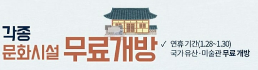 설 연휴를 맞아 각종 문화시설에서도 무료 입장 혜택을 제공합니다. 여러 국립 관광지에서는 무료로 입장이 가능하니, 고향방문시에 사전에 방문할 장소를 체크하고 일정을 짜시는 것이 좋습니다.