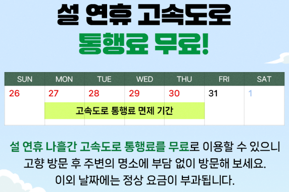2025년 설 연휴를 맞이하여 고속도로 통행료 무료, 주차료 면제 또는 할인 혜택 등의 정보를 자세히 안내드리겠습니다.