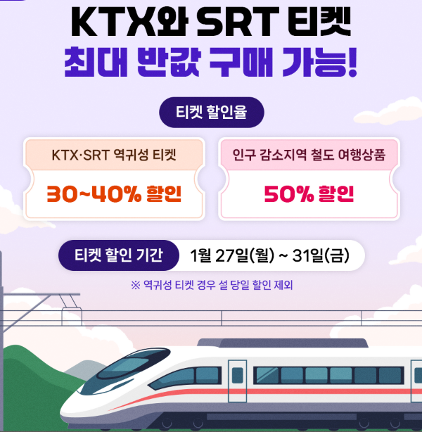 KTX 및 SRT 역귀성 티켓의 경우 30~40% 할인 금액으로 구매 가능하며, 인구 감소지역 철도 여행상품은 50% 할인 금액으로 구매가 가능합니다.
