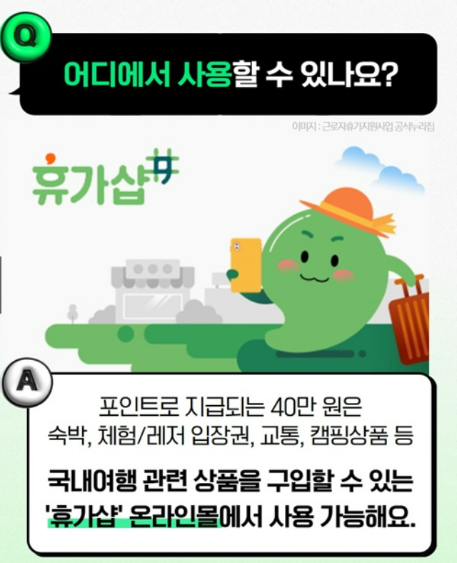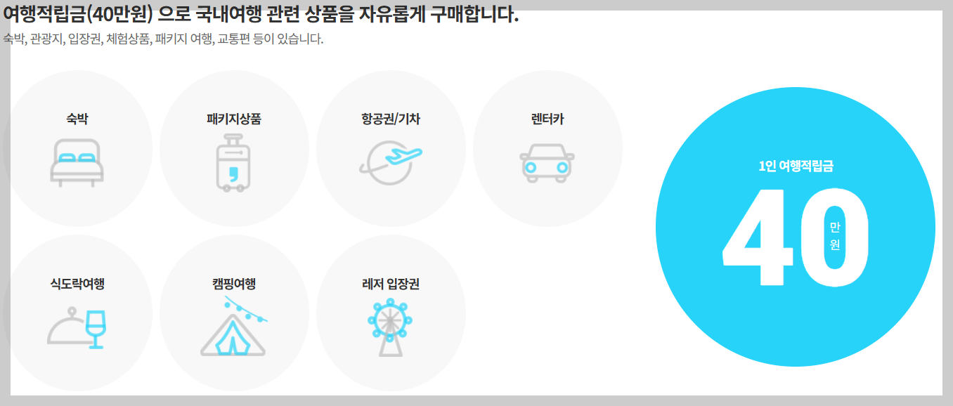 근로자에게 적립된 40만원은 휴가샵 온라인몰에서 국내여행 관련 상품을 자유롭게 구매할 수 있습니다.