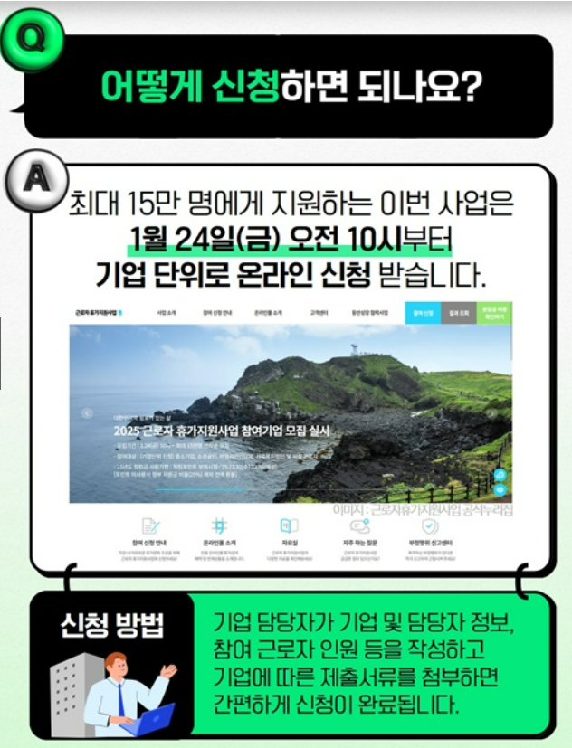 2025년 근로자 휴가지원사업 참여기업 모집은 1월 24일(금) 오전10시부터 시작되며, 최대 15만명 선착순 모집입니다.