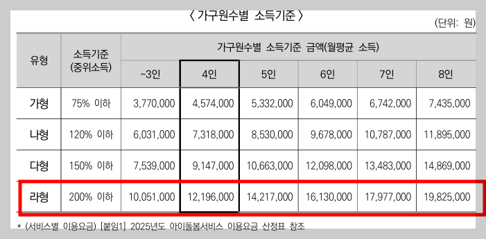 1) 가~라형 : 양육공백이 발생하는 가정 중에서 기준 중위소득이 200% 이하인 가구
